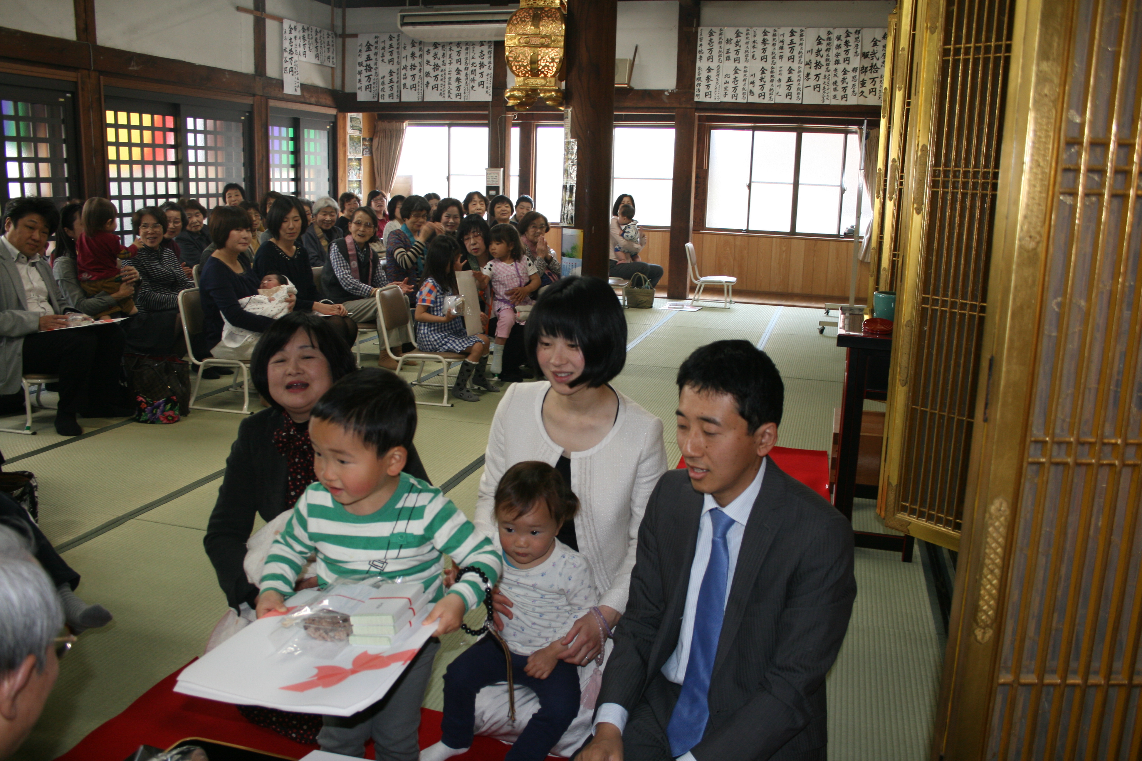 4月16日午後、三全仏教婦人会主催の初参式&降誕会が賑やかに勤まりました。仏婦が手作り赤飯でお祝い。初参式には新しく小杉の住人になった二家族、若嫁の友人、お稚児さんでお誘いした人、それに我が家の内孫2名、外孫3名も計5名も加わって賑々しくいとなまれました、「らいはいの歌」のお勤め、その間に赤ちゃんと親が焼香、住職の挨拶と前門様からのメッセージ、『小さき吾子に』斉唱、記念写真などのプログラム。参加費は千円。初参式の記念冊子、子供用数珠、赤飯、写真などがもらえます。30年近く続く伝統行事です。地域の皆さんが、子供の健やかな成長を願って始まり、長く続いています。「子は宝」これからも仏の子供として元気に育って欲しいと願っています。 |