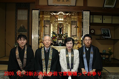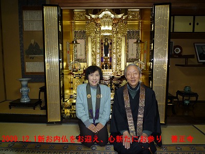 ☆HPアクセス数は2010、04、23現在で20、000回を突破。皆様のご訪問ありがたく、感謝申し上げます。最近は「住職と坊守のつれづれ日記」の訪問が一日40回から50回の割合で増加中。「毎日見ているよ」と、ご門徒さん以外の人からも気軽に声をかけられるようになりました。私たちが今出来る「寺からの情報発信」です。家の事情をあからさまにお伝えして、皆様からのお声を戴くのが、私たちの励みです。 >☆12月5日夜、お内仏報恩講を勤めました。50名ほどの人が集い、庫裡4間を開けて、初挑戦の宗祖讃仰第三種の音楽法要で勤めました。 ☆庫裡仏間に新しいお仏壇をお迎えしました。 結婚35年目、坊守が還暦の節目に、長年の夢だったお宮殿、須弥檀の付いた本格的な作り付けの仏壇をお迎えしました。これからもこのお仏壇を中心に、家族心を一つにして、精進いたします。