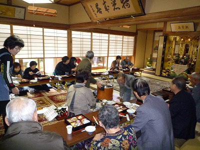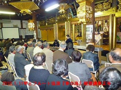 平成22年の幕開けの報恩講は1月11日、12日にお勤めしました。今年のご講師は藤大慶先生(綾部市、ルンビニ苑理事長)歯切れのよいお話に連日100名近い人々が参詣。特に初日夜のミニコンサートは、琴・フルートによる『春の海』、フルート、ピアノによる「初恋」「早春賦」「川の流れのように」を全員で合唱。本堂に皆さんの歌声が響き渡りました。藤先生のお話は、青木新門著「納棺夫日記」を元にした映画「おくりびと」を、浄土真宗の立場から味わわれたお話。先生の3つの言葉「すまんのう」「ありがとう」「なまんだぶ」だけはいくつになっても忘れないように心に刻みました。 また初日の、お非時(昼食)は手作りで大好評。「毎年レベルアップしている」とお褒めの言葉を頂きました。これも全て、協力して下さるご門徒さんや、応援して下さる方々、参詣してくださる沢山の皆様のおかげです。今年還暦の私は、35回目の報恩講も無事終えることが出来、感謝しています。 |