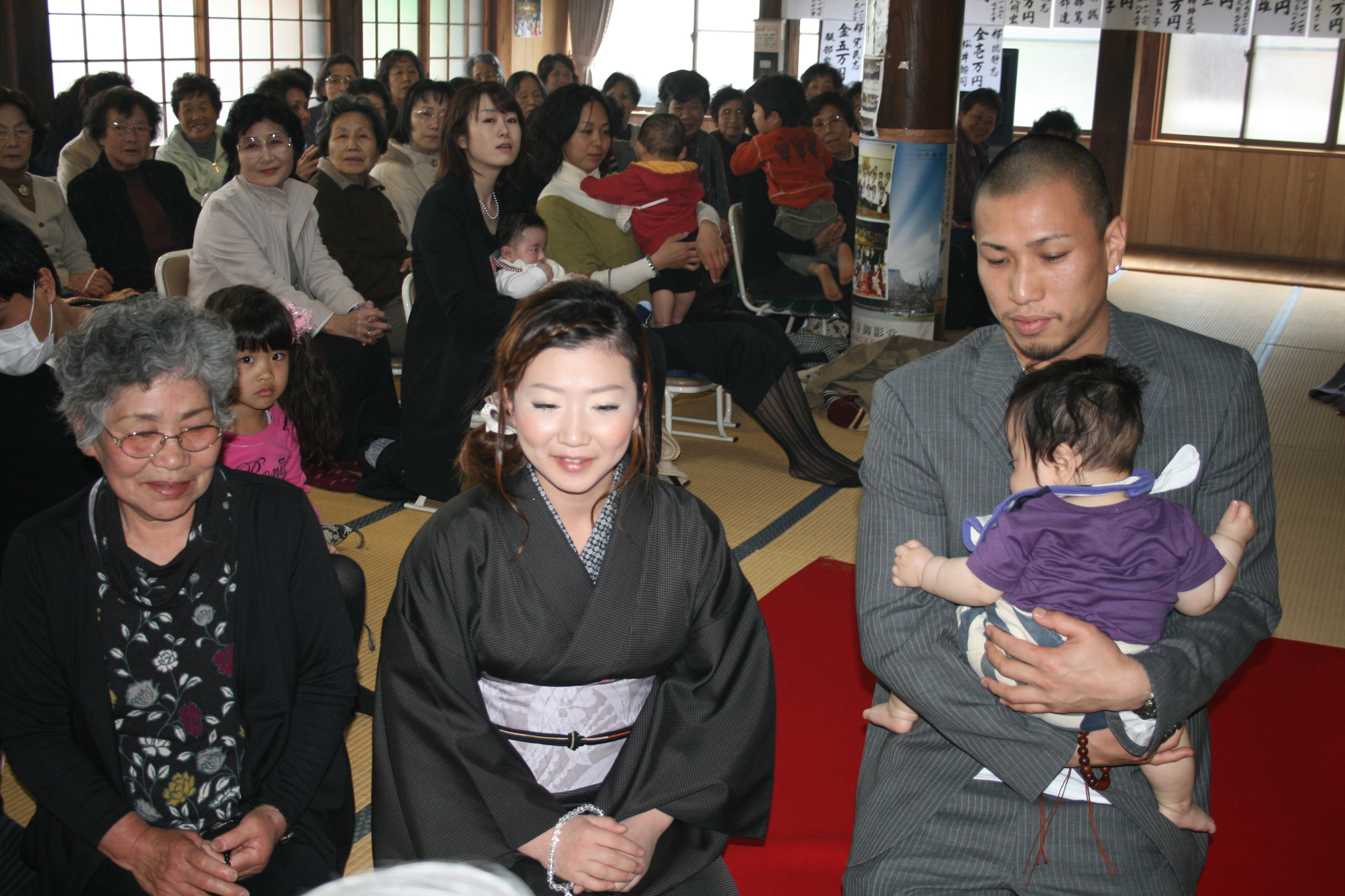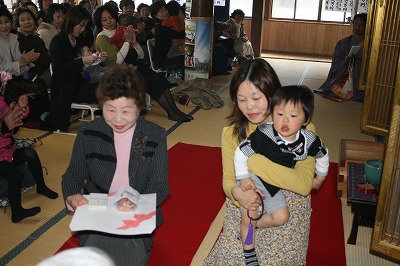 ☆4月17日午後、三全仏教婦人会主催の初参式が勤まった。同時に降誕会も勤まる。 昨日の初参式は、本堂に溢れんばかりの100名以上の人々で賑やかだった。 少子化と叫ばれているが、14名(男10名、女4名)の赤ちゃんが、お寺に参って下さるとは予想もしていなかった。 「赤ちゃんの力は偉大!」普段お寺に一度もご縁のなかった若いお母さん、お父さんを引き連れての参拝。親子共々一緒に焼香する姿は麗しい。これもお導き下さるお婆ちゃん、お爺ちゃんご先祖方のおかげ。 「今時の若い者は・・・」と非難がましいことを言うが、決して若い人々だけが悪いのではない。ちゃんと指導しなかった親世代の責任が大きい。 お寺に参って手を合わす習慣のあるご家庭では、抵抗なく「初参式」の参加を頂ける。皆さんの顔付きを見ていると何と柔和なこと!我が子、我が孫に寄せる期待の多きことが伺える。 思えば今日初参式に参加した赤ちゃん達が成長して大人になった時、私達老人世代の老後のお世話はこの子達の肩にかかっているのだ。 そう考えるならば、団塊世代の人が年金を自分のことにだけ使うのではなく、未来の子供達のために役立てる心つもりが必要だろう。 「若い者ことは知らん、勝手にしろ。後は野となれ山となれ」では、若い人々もそっぽ向くのは当然。 こうした行事のおかげで、世代間を越えた「いのちのバトンタッチ」の大切さを考えさせられた。 20年以上続く「初参式」。赤ちゃんがいないから止めようと言うのは、主催者側の意識の怠慢。募集して声をかける努力を惜しまなければ、赤ちゃんにも仏縁を結んでいただける。 その後の仏婦主催の降誕会(|ごうたんえ)。赤飯のおにぎりを6升、仏婦の皆さんで手作りしたが、足りないほどの人出だった。嬉しい悲鳴だ。ご講師のK先生の体当たりの熱のこもったご法話にも魅了された。先生ご自身ニトロを持参のお説教。これ以上心臓に負担がかからないよう、2年後も元気なお姿で再会できることをお約束した。(充子)