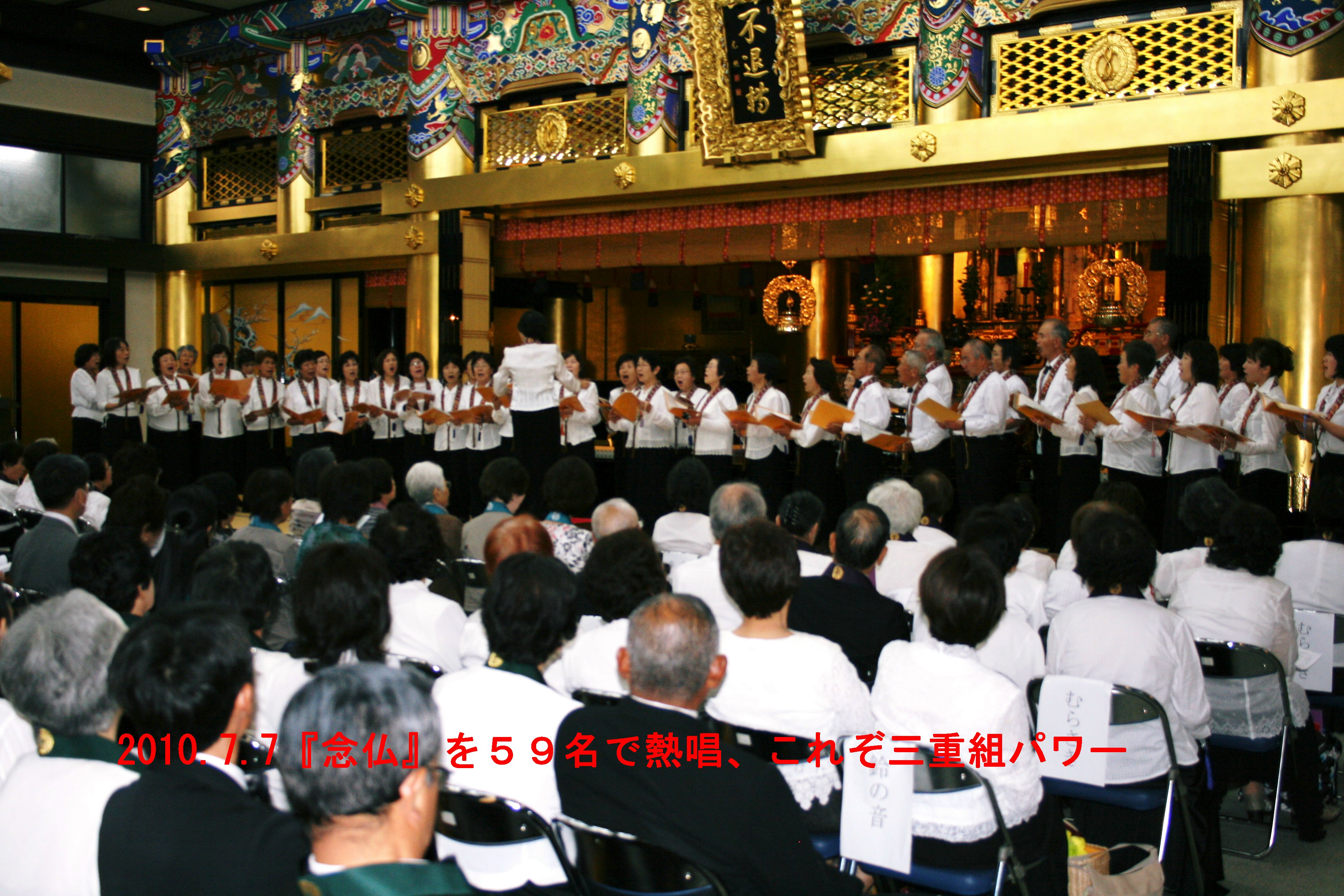 七夕の日の今日、名古屋別院で第6回東海仏教音楽の集いが開催されました。 我が三重組コーラスからも59名が参加。 全体で256名の参加。約4分の1の、参加団体中最多人数で、三重組のパーワーを披露しました。 歌はお待ち受けでも歌った『念仏』。 全員の歌声が、私の指揮に合わせて、本堂に響き渡ります。 歌い終えた後の皆さんの充実した笑顔が、何にも増して嬉しそうでした。 午後は波多野先生の歌唱指導と、ドイツ仕込みの歌のご披露がありました。 参加10団体。岐阜、三重、愛知から仏教讃歌を愛する人々が集いました。関係した役員の皆様、お世話をお掛けしました。 |