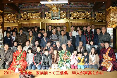 明けましておめでとうございます。 2011年がスタートしました。今年は親鸞聖人750回大遠忌法要がご本山で、60日間、半年以上に渡って勤まる記念すべき年です。 善正寺にとりましても、4月3日に長男結婚式、10月15日に京都西本願寺バスで団体参拝、その外にも大きな行事をいっぱい抱えています。 皆様と共に歩むお寺、皆様に支えられるお寺でありたいとの願いから、私達寺族も一丸となって精進します。 どうか今年も皆様のご協力よろしくお願い申し上げます。 写真は2011年元旦会の模様です。 今年も大勢の皆様が、ご家族揃ってお参り下さいました。 帰省した孫さんたちを連れて、一緒にお寺に参拝されるおじいちゃん、おばあちゃんの嬉しそうなお顔! この家族の絆「家族力」こそ、未来に伝えたい教育ではないでしょうか? どうかいつまでもこの伝統が受け継がれますようにお願いします。 |