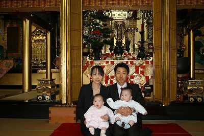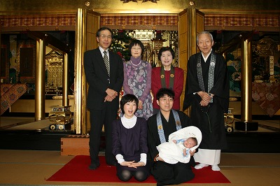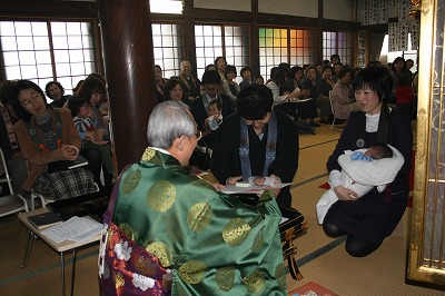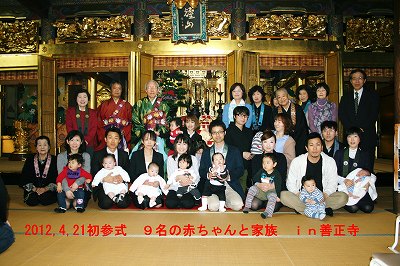 平成24年度、三全仏教婦人会主催の「初参式と降誕会(ごうたんえ)」が、今年は善正寺で営まれた。隔年で隣寺と会場が変わる。 一年間の募集で9名の赤ちゃん(男児6名、女児3名)と、その両親、祖父母らが付き添って、賑やかな雰囲気。 わが初孫亮爾も、生後一ヶ月ながら最年少で受式。 松阪から嫁の両親も駆けつけ一緒にお祝いして下さった。 赤ちゃんの力は偉大! たった一人の赤ちゃんが両親、両方の祖父母、総勢6人の大人を連れてくる! 地域の人々も一緒にお祝いしようと、早くから駆けつけ、特に写真を撮る時には、カメラ目線になるように赤ちゃんをあやして下さった。 三全仏教婦人会という100年以上続く団体が、赤飯のお結びを参詣者に振舞った。 また初参式を受ける赤ちゃんには冊子と赤飯、小さい数珠が懸念品として贈呈。後日記念写真も配られる。 少子化の時代、こうした行事が続くことは、関係者の並々ならぬご尽力のおかげ。子供をみんなで育てていこう。仏の子供として大切に育てたいという気持ちが伝わった。かげ。子供をみんなで育てていこう。仏の子供として大切に育てたいという気持ちが伝わった。 |