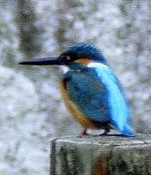 9月13日朝、垂坂山にカワセミを見つけました。 ご門徒さんの服部香苗氏が、一眼レフカメラで撮影し、メールで添付して下さいました。私も少し前に、北側斜面の「モネの睡蓮池」のような小さい池で、この鳥を見つけました。 野鳥の本によると、金属光沢のある緑色の翼と、コバルトブルーの背中、橙色の腹、黒くて長いくちばしをもつ体調17センチ位の鳥です。 飛びながら「チー」という声で鳴きます。 水面に張り出した横枝や水中の杭、石などの下の魚を探し、水中に飛び込んで餌をとります。 一直線に飛んでいたかと思ったら突然急降下することもあります。 川岸の崖に巣穴を作って繁殖するそうです。 |