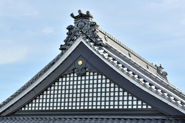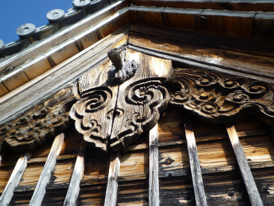 約2か月に渡って工事が進められていました本堂屋根両側面工事が、5月19日完了しました。 屋根瓦は少しずつ葺き替えていましたが、側面版までは手が回りませんでした。 しかし本堂内部から斜めに仰ぎ見ると、青空が透けて見えます。台風や風雨が激しい時には畳の上に土砂や枯葉のゴミが落ちました。 これではせっかく屋根瓦や本堂内陣天井を一新しても元の木阿弥。 点検してもらったところ、老朽化が激しく応急処置では追いつかないとのこと。思切ってアルミで作り直すことにしました。富山の専門業者と地元の大工さんの共同作業で、長い年月風雨に耐えうるものが完成しました。 私達もこれで少しは安心です。 そこで一句 『緑風に 屋根映え護る ほとけさま」 新緑を吹き渡る心地よい風に、新しくなったけぎょの金色飾り棒が輝いて見えます。 |