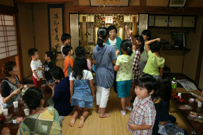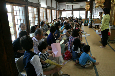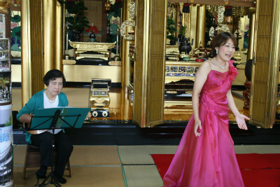 若嫁企画のファミリイコンサートが9月12日午前開催されました。 三重オペラ協会の歌手(若嫁の友人)とピアニストが共演。 80名余りの赤ちゃん、子供、ママ友、お年寄りなどが来訪。 コンサート終了後は庫裏で手作りの炊き込みご飯。 皆で食べる『寺ご飯』に子供達も大喜び。 楽しい思い出となってくれたことでしょう。 また全国から寄せられたお土産の景品(手袋、帽子、靴下、ポーチ、マフラーなど)もプレゼント。とても楽しいひと時でした。 |